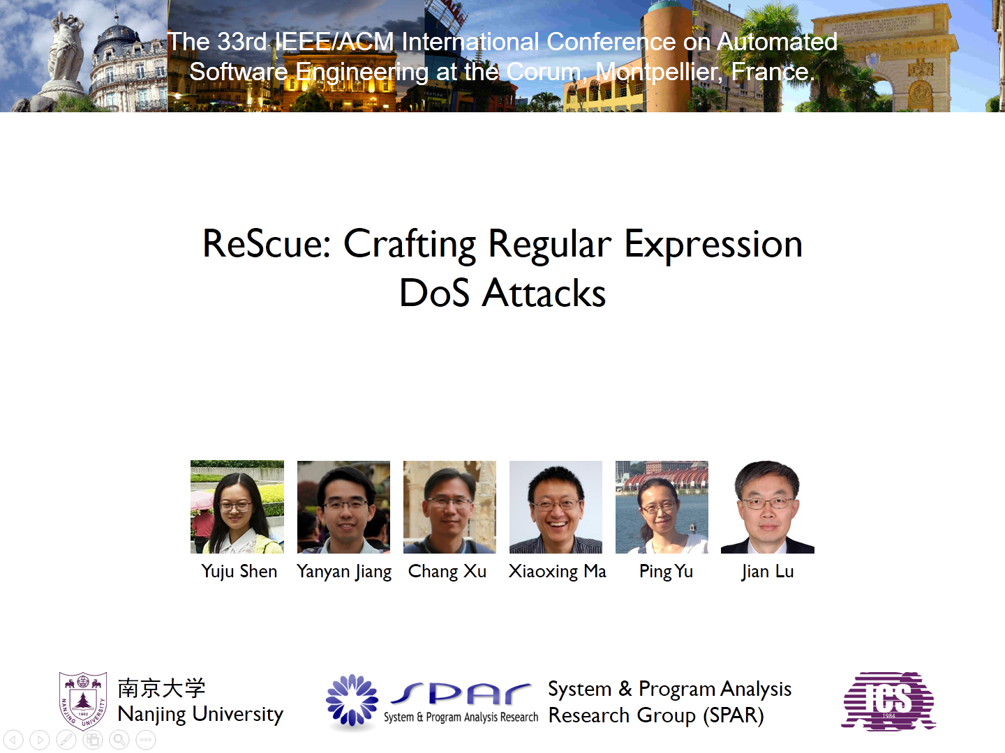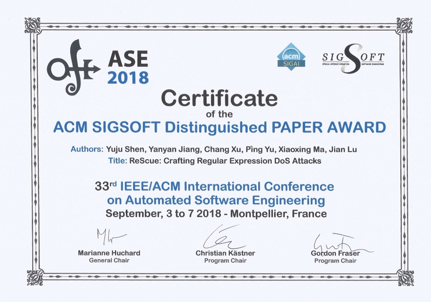 2018年9月3日至7日,第33届IEEE/ACM International Conference on Automated Software Engineering(ASE 2018)在法国蒙彼利埃举行,tyc41183太阳成集团计算机软件研究所由蒋炎岩博士具体指导的硕士研究生沈宇桔的论文“ReScue: Crafting Regular Expression DoS Attacks”荣获本次会议的ACM SIGSOFT Distinguished Paper Award。该论文由tyc41183太阳成集团独立完成,并在该会议上首次获得杰出论文奖的突破。