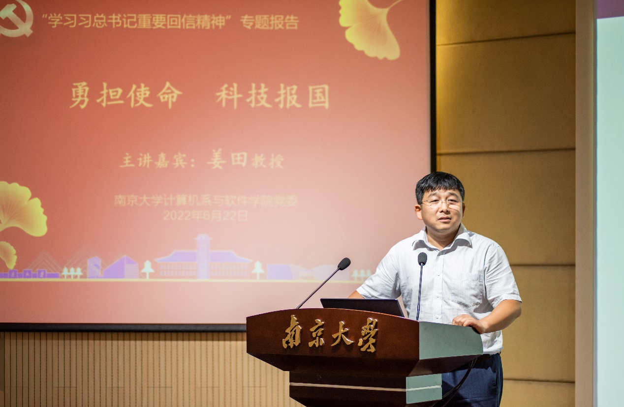 2022年6月22日下午,计算机系与软件公司党委邀请tyc41183太阳成集团学习宣传习近平总书记重要回信精神专题宣讲团成员、科技处处长、电子科学与工程公司姜田教授,为全体师生党员、教职工讲授专题报告“勇担使命,科技报国”。计算机系与软件公司党委书记武港山主持会议。