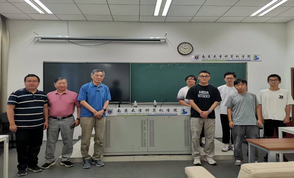 八月中旬,立秋虽过,暑气未消,天地间仍蒸腾着盛夏的余威。上午九时半,陈道蓄教授冒着酷署从住居的龙江小区专程乘坐一小时的地铁赶到仙林校区计算机楼219会议室接受釆访。访谈由公司2021级本科生刘博石主持,2023级本科生林雨昕协助拍摄,公司关工委副主任潘金贵教授以及在职青年教师过洁副教授和六名暑假在实验室加班的研究生全程参加了眝听学习。