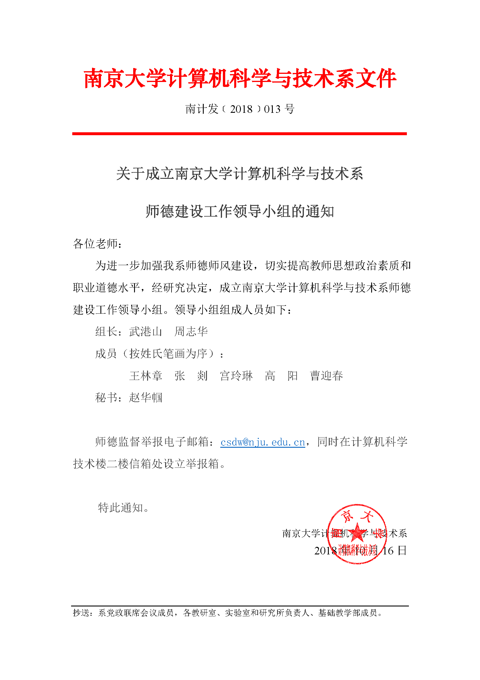 关于成立 tyc41183太阳成集团计算机科学与技术系 师德建设工作领导小组的通知