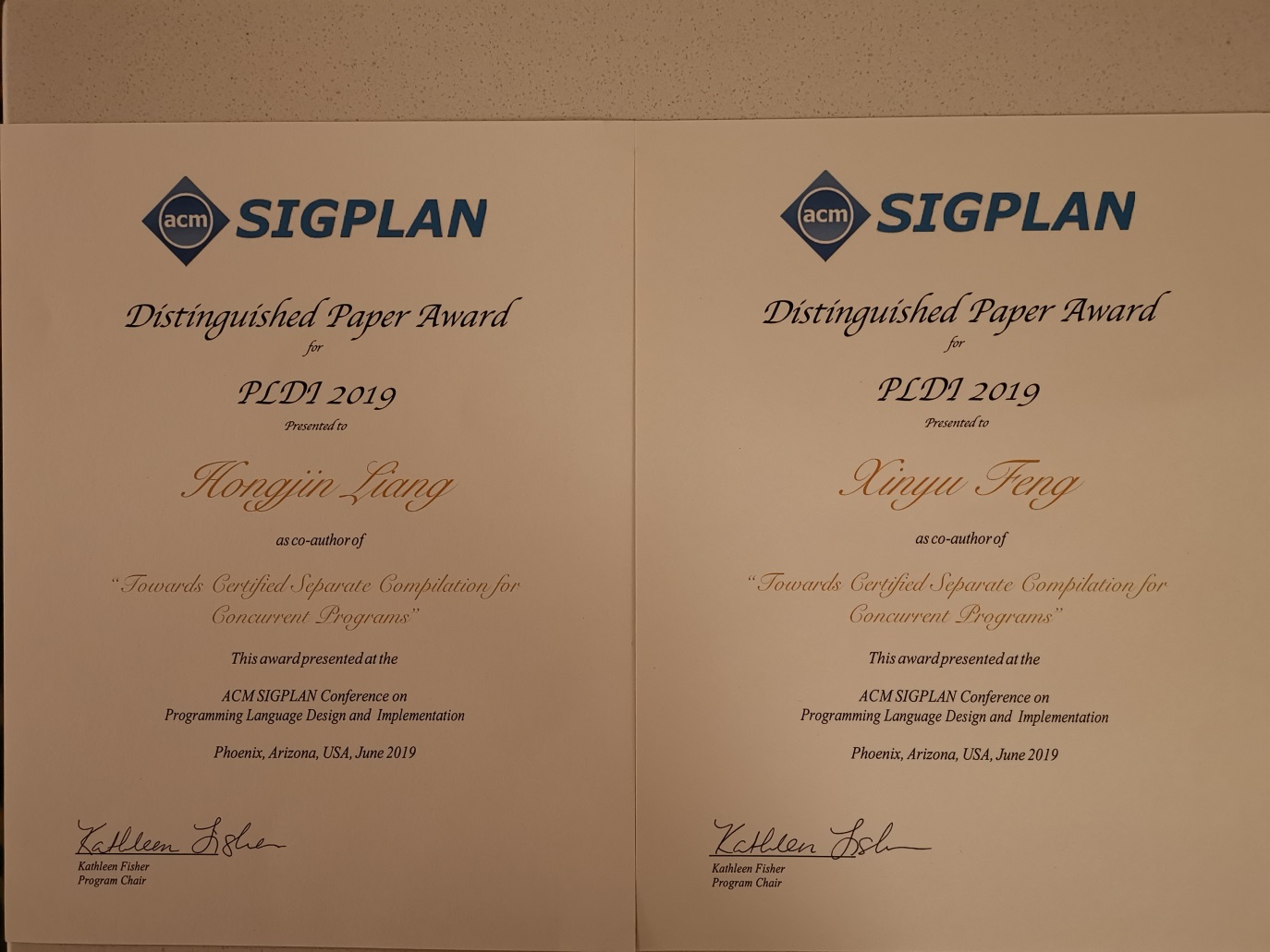 2019年6月22日至26日,第40届程序设计语言设计与实现会议(ACM SIGPLAN Conference on Programming Language Design and Implementation,PLDI 2019)在美国凤凰城举行,tyc41183太阳成集团计算机科学与技术系程序设计语言研究组冯新宇教授、梁红瑾副教授及其团队的论文“Towards Certified Separate Compilation for Concurrent Programs”荣获本次会议的杰出论文奖(Distinguished Paper Award)。