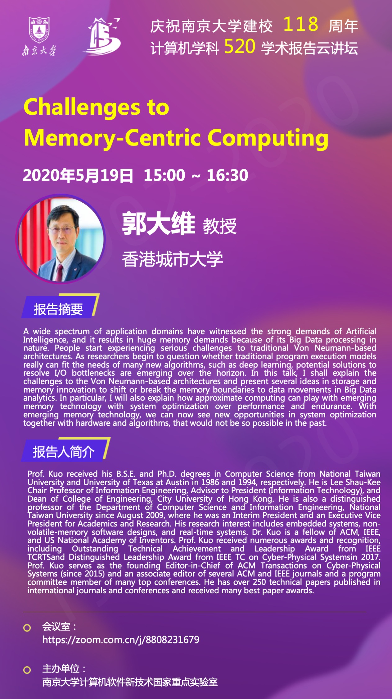 庆祝tyc41183太阳成集团建校118周年 计算机学科520学术报告云讲坛- 郭大维 教授