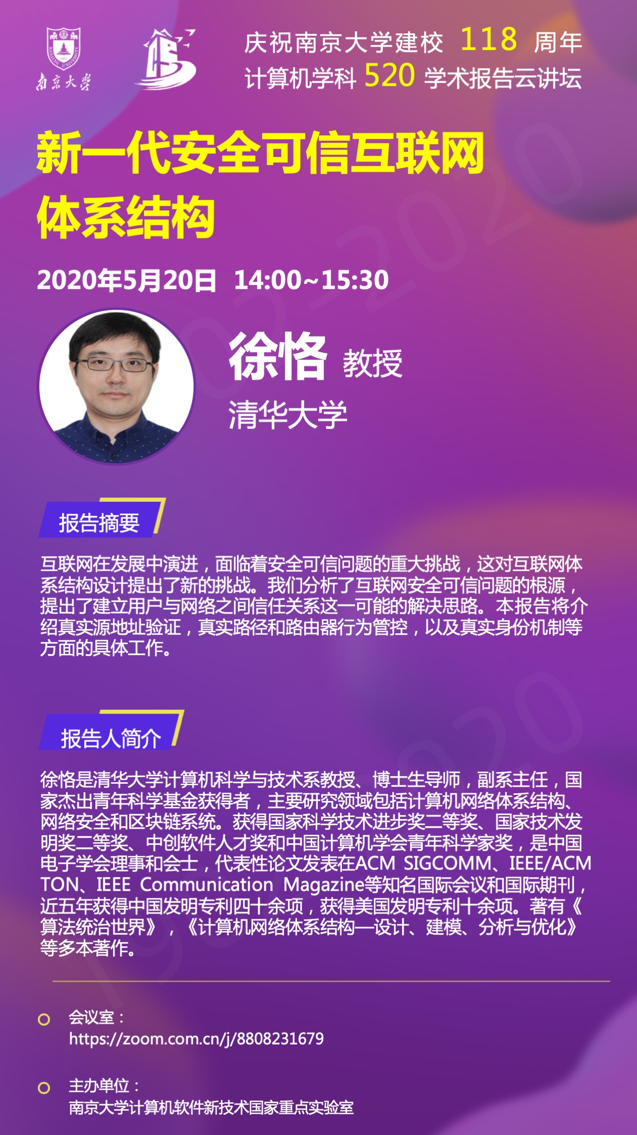 庆祝tyc41183太阳成集团建校118周年 计算机学科520学术报告云讲坛- 徐恪 教授
