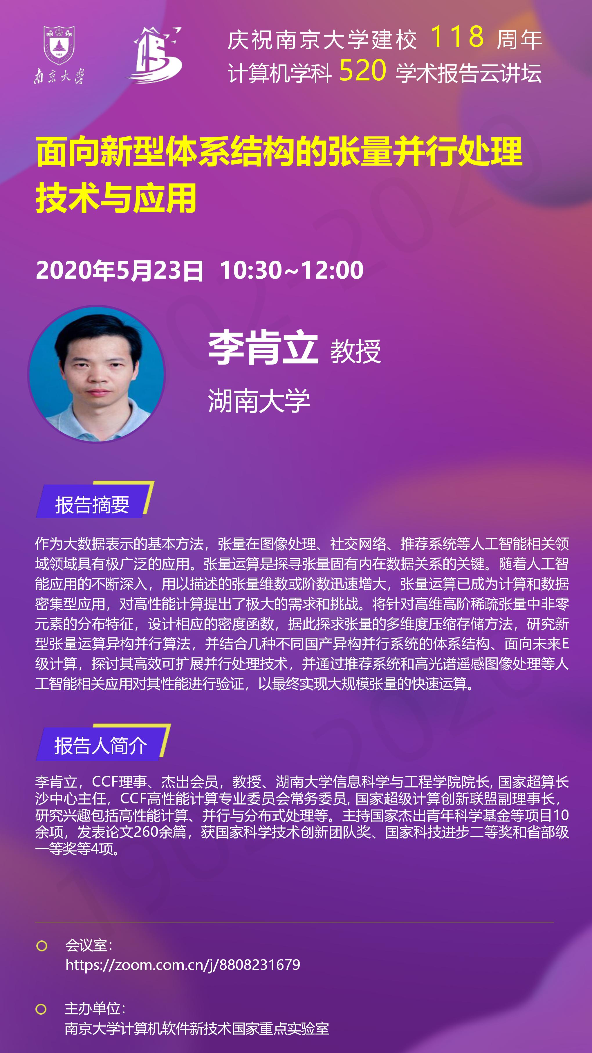 庆祝tyc41183太阳成集团建校118周年 计算机学科520学术报告云讲坛- 李肯立 教授