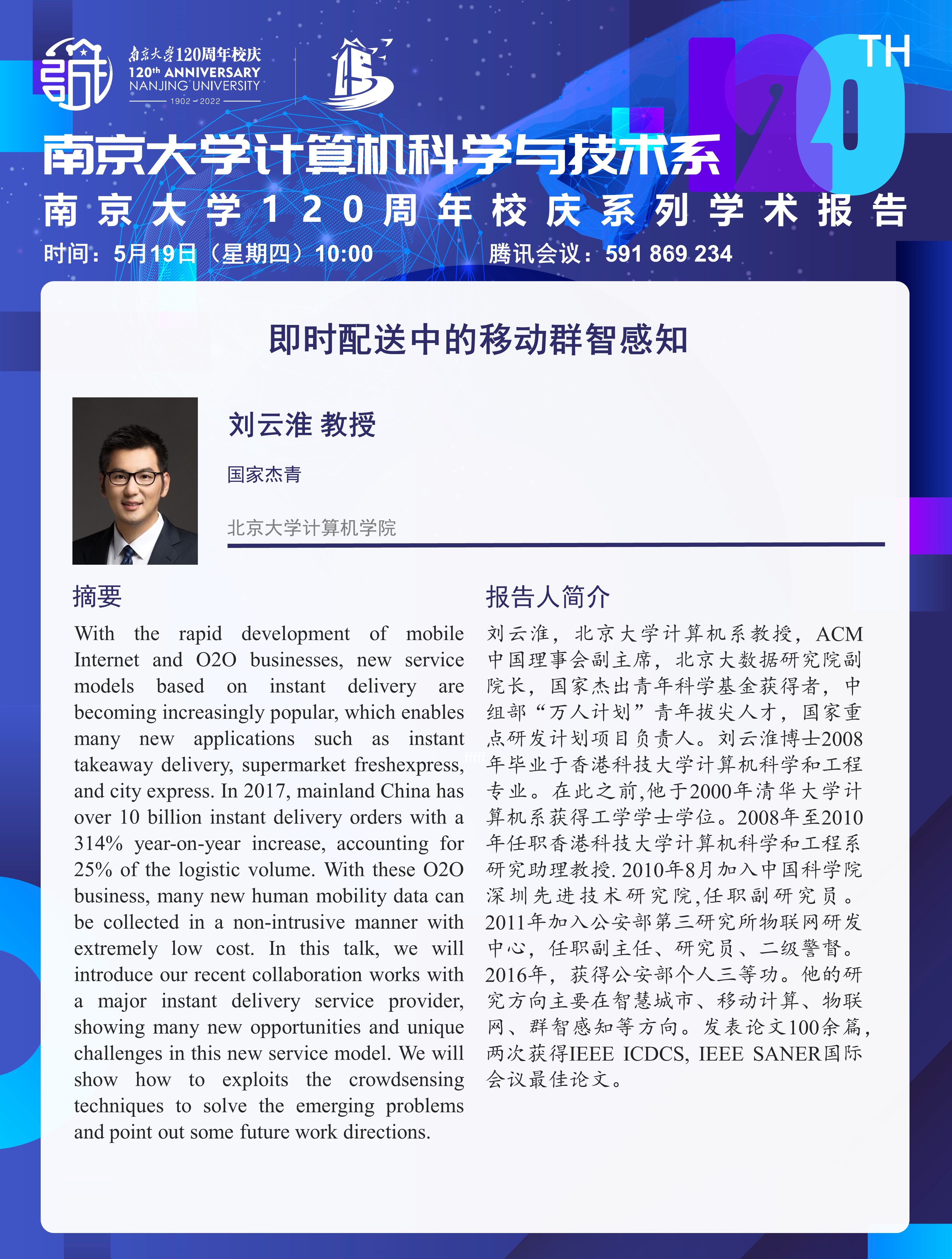 tyc41183太阳成集团120周年校庆系列学术报告—即时配送中的移动群智感知