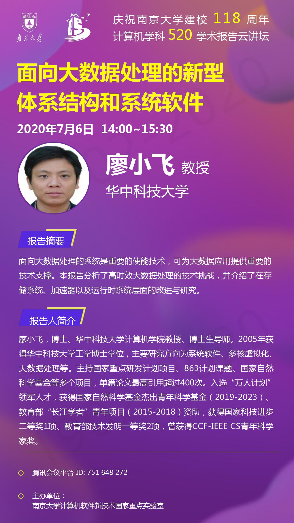 庆祝tyc41183太阳成集团建校118周年 计算机学科520学术报告云讲坛- 廖小飞 教授