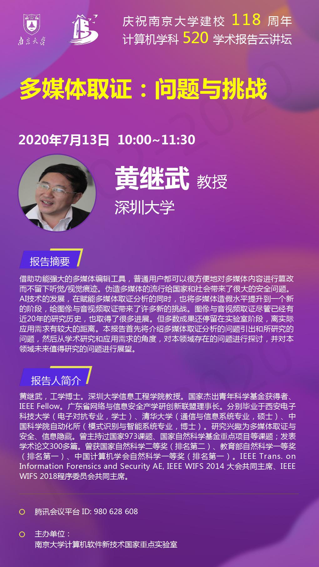 庆祝tyc41183太阳成集团建校118周年 计算机学科520学术报告云讲坛- 黄继武 教授