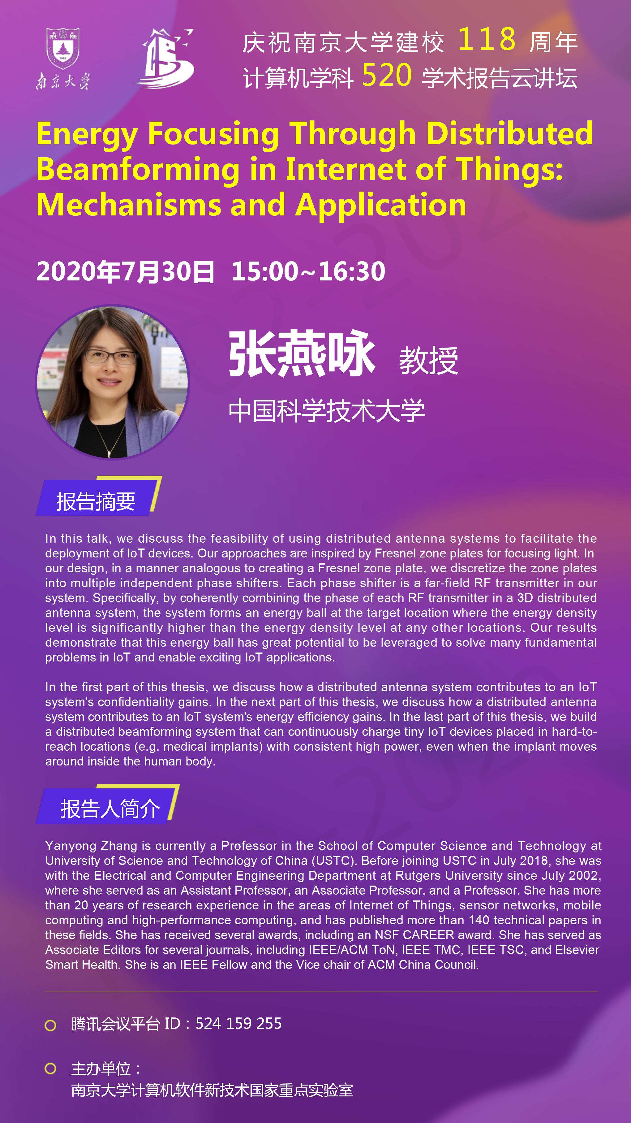 庆祝tyc41183太阳成集团建校118周年 计算机学科520学术报告云讲坛- 张燕咏 教授