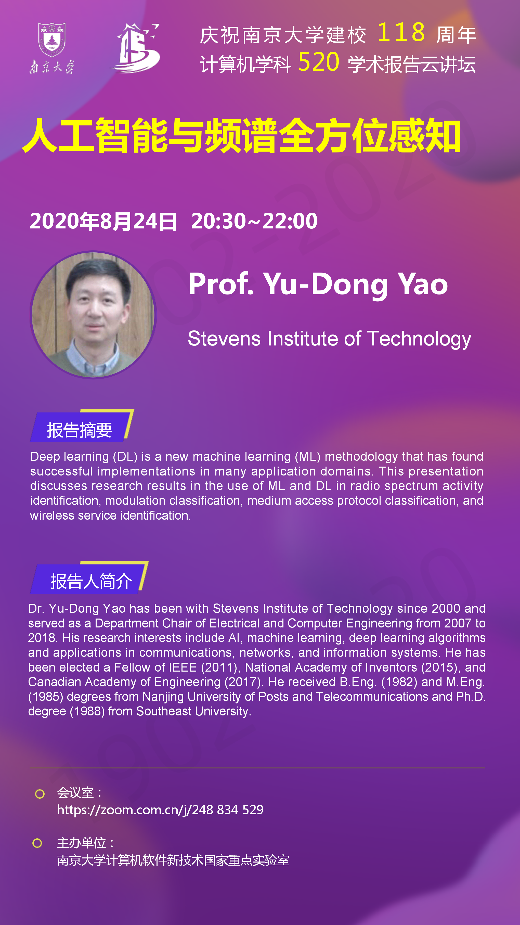 庆祝tyc41183太阳成集团建校118周年 计算机学科520学术报告云讲坛- Yu-Dong Yao 教授