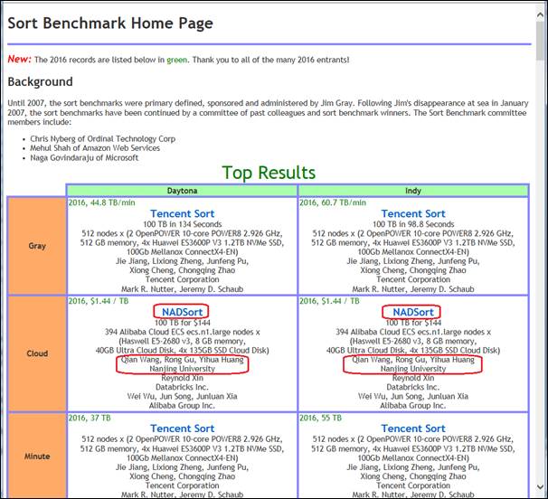 喜讯:2016年11月10日,有“计算界奥运会”[d1]之称的国际著名Sort Benchmark全球数据排序大赛(http://sortbenchmark.org/),官网公布了2016年全球大数据排序性能评测大赛结果。