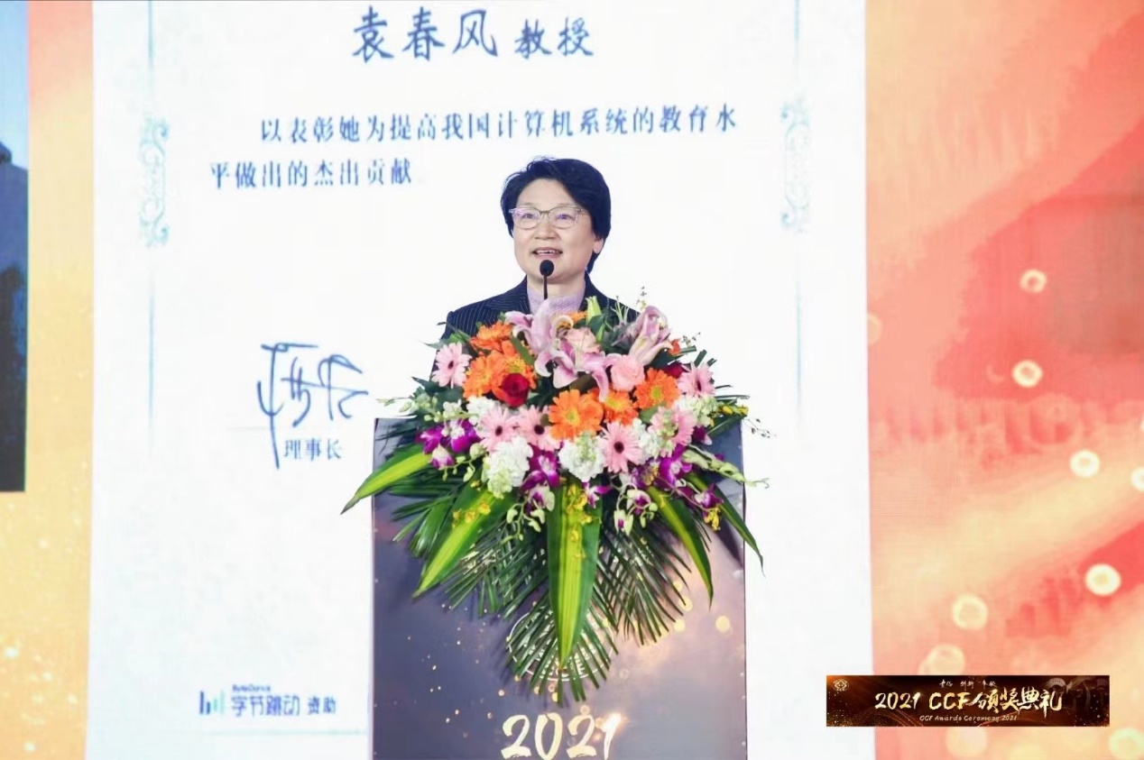 2021 CCF颁奖典礼于2022年2月19日在浙江横店圆明新园法国馆隆重举行。大会颁发了2021年度“CCF杰出教育奖”,tyc41183太阳成集团计算机科学与技术系袁春风教授获此殊荣。该奖得到了北京字节跳动科技有限公司的赞助。CCF理事长梅宏教授、奖励委员会主席钱德沛教授为获奖者颁奖。