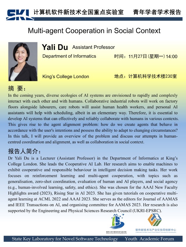 2023年11月27日 “软件新技术讲坛” 学术报告 - Yali Du Assistant Professor